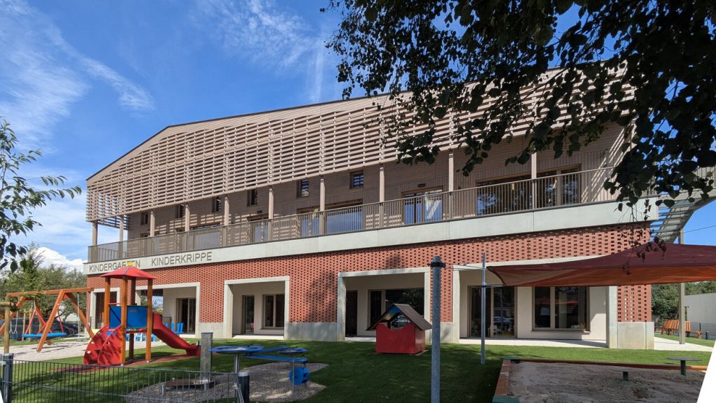 Der zweigeschossige Neubau, geplant von Architektin Nina Kuess, vereint Funktionalität und zeitgemäße Architektur: Im Erdgeschoss finden zwei Kinderkrippen-Gruppen Platz, im Obergeschoss stehen Räumlichkeiten für drei Kindergarten-Gruppen zur Verfügung.
