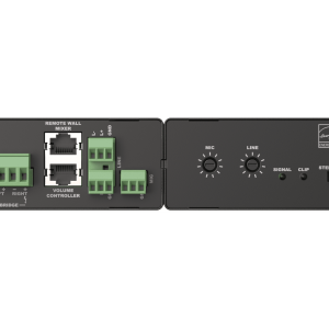 Für Anwendungen, bei denen lokales Mischen für die Eingänge erwünscht ist, kann ein abgesetzter Wandmischer angeschlossen werden, während große Entfernungen zwischen der Quelle und dem Verstärker mit einer einfachen CAT5E- oder höheren Twisted-Pair-Verkabelung überbrückt werden können. Der Lautstärkereglereingang ermöglicht den Anschluss eines zusätzlichen Wandreglers zur Gesamtlautstärkeregelung.