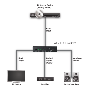 Converter/ Deembedder der den Anschluss von HDMI2.0, HDCP2.2 erlaubt und gibt dieses als HDMI2.0, HDCP2.2 und separat als ein Toslink bis 5.1 Audio oder ein analoges Stereo Audio aus. Durch den eingebauten Extender kann das HDMI Signal mit UHD/ 4K@60Hz bis 5m übertragen werden.