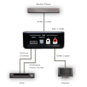 Converter, der den Anschluss von HDMI, HDCP1.2 und DVI1.0 erlaubt und gibt dieses als HDMI, HDCP1.2 und DVI1.0 und separat als ein Toslink oder ein analoges Stereo Audio aus.