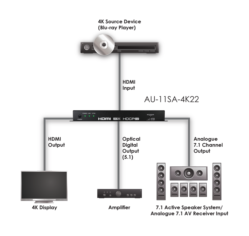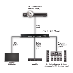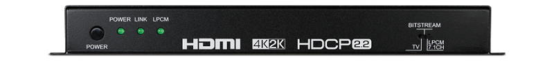 Converter/ Deembedder der den Anschluss von HDMI2.0, HDCP2.2 erlaubt und gibt dieses als HDMI2.0, HDCP2.2 und separat als ein Toslink oder ein analoges Audio (Stereo Audio, 5.1, 7.1) aus. Durch den eingebauten Extender kann das HDMI Signal mit UHD/ 4K@60Hz bis 5m übertragen werden.