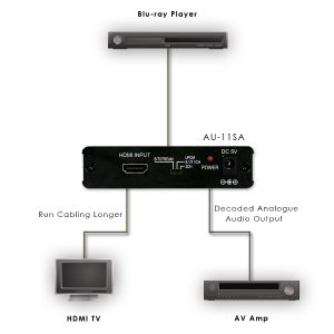 Converter, der den Anschluss von HDMI1.3, HDCP1.1 und DVI1.0 erlaubt und gibt dieses als HDMI1.3, HDCP1.2, DVI1.0 und separat über analogen Mehrkanal-Ausgangs-Ports als LPCM 7.1, 5.1 oder Stereo Audio aus.