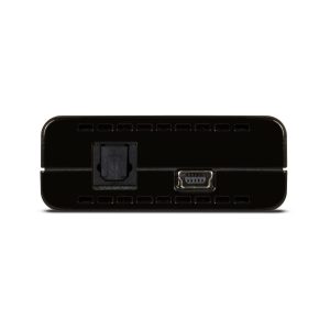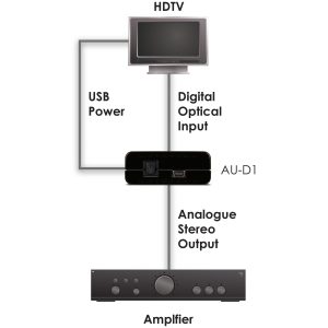 Der AU-D1 ist ein Digital-Analog-Audiokonverter (DAC), mit dem der Benutzer digitale optische Signale einfach in analoges L/R-Stereo umwandeln und an einen beliebigen AV-Receiver anschließen kann. Mit Unterstützung von Audio-Abtastraten bis zu 96 kHz/24 Bit bietet er eine hochwertige Klangkonvertierung, die sich perfekt für den Anschluss des digitalen Audioausgangs eines Fernsehers an einen analogen AV-Receiver oder -Verstärker eignet. Dieses Gerät eignet sich auch ideal für den Einsatz in digitalen Aufnahmesystemen, Computer-Audiosystemen oder digitalen Mischpulten und wird über jeden USB-Anschluss mit Strom versorgt, sodass es mit USB-fähigen HDTVs, Blu-ray-Playern oder Computern ohne separates Netzteil verwendet werden kann. Da viele HDTVs der neuesten Generation nur noch über einen optischen Audioausgang verfügen, ermöglicht der AU-D1 dem Benutzer die einfache Integration des digitalen Audiosignals in seinen AV-Receiver.