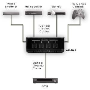 Schalter, der die Umschaltung von 4 verschiedenen Audioquellen auf ein Endgerät erlaubt. Alle Signale werden ohne Verzögerung übertragen. Der AU-D41 speichert die zuletzt genutzte Einstellung und ist fernbedienbar.