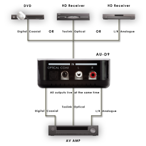 Converter, der den Anschluss von analogen Audio zu digitalen Audio und von digitalen Audio zu analogen Audio erlaubt. Verarbeitet Digital Audio (SPDIF oder Toslink) und analoges Audio (Stereo Audio). Gleichzeitiger output aller 3 Audioformate ohne Verlust.