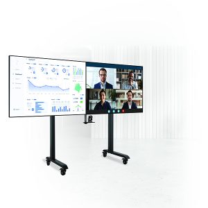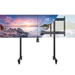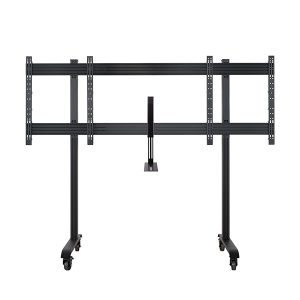 Der BT8517 ist eine hochwertige mobile Montageslösung, die entwickelt wurde, um zwei Bildschirme nebeneinander für Videokonferenzanwendungen zu montieren. Die nicht-markierenden Bremsrollen ermöglichen es, den Wagen einfach und sicher umzustellen, ohne den Boden zu kratzen, während das integrierte Kabelmanagement alle Verbindungskabel für eine ordentliche Installation verbirgt. Die Schnittstellenteile verfügen über Nivellierschrauben, um die Höhe der Bildschirme anzupassen und auszurichten, und ein VC-Regal mit verstellbarem Montagearm ermöglicht es, eine Kamera über oder unter den Bildschirmen zu befestigen.