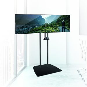 Universelles Design geeignet für die Montage von zwei mittelgroßen Bildschirmen nebeneinander. Beinhaltet ein VC-Regal, das über oder unter den Bildschirmen fixiert werden kann. Geliefert mit Gummi-Füßen, um unebene Bodenflächen auszugleichen. Enthält Handgriffe für eine einfache Handhabung. Die Arme verfügen über Nivellierschrauben zur Anpassung der Bildschirmhöhe. Mit dem kompatiblen Zubehör wie Regalen können Kragen an den Ø50mm-Stangen angebracht werden. Integrierte Kabelmanagement für eine saubere und ordentliche Installation.Sicherheits-Schrauben helfen, eine unbefugte Entfernung des Bildschirms zu verhindern. Einfache ‚Aufhäng‘-Bildschirminstallation.