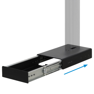 Durch den verschiebbaren Bodensockel wird die Säule/der Präsentationsständer nach hinten eingefahren
