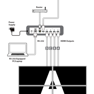 Ermöglicht die Darstellung eines HDMI Signals 4K@60Hz 4:4:4 auf einer Videowand in unterschiedlichen Konfigurationen von 2×2 bis 8×8. Jeder Ausgang liefert eine Auflösung von 1080p@60Hz.