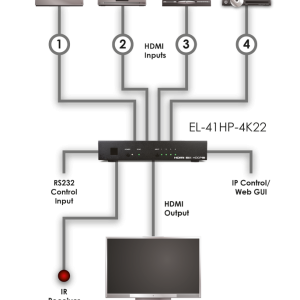 Schaltet 4 HDMI2.0 Signale auf 1 Wiedergabegerät mit der fast switching Technologie. Kann via Autoswitching, Fronttasten, RS232, IR oder IP gesteuert werden. Unterstützt UHD/ 4K und 3D. Der HDMI Eingang unterstützt Standard oder Apple- HDCP modes.