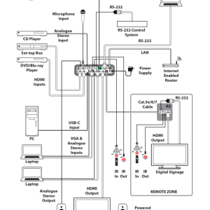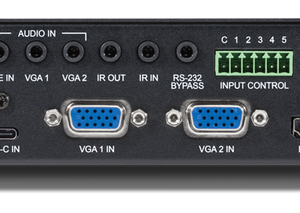 Erlaubt den Anschluss von 1 USB-C (60 Watt), 2 HDMI sowie 2 VGA-Signalen mit analogem Audio und gibt dieses als HDMI und HDBaseT Signal (100m) mit 640×480 bis 1920×1200 oder von 480i bis 1080p, UHD/ 4K 4:4:4 mit analogen Audioausgang aus. Bei VGA ist die max. Auflösung 1920×1200 mit RB. Mit den HDBaseT Ausgang kann HDMI, IR und RS232 zum Wiedergabegerät übertragen werden. Der optionale Receiver wird über PoH (Power over HDBaseT) versorgt. Zusätzlich kann ein Mikrofon 48V mit Phantomspeisung angeschlossen werden. Mit den zusätzlichen Funktionen wie Aspect Ratio, Underscan/ Overscan und weitere Bildeinstellungsmöglichkeiten sowie der Audio DSP mit Mixing und Gain-Einstellung können optimale Ergebnisse erzielt werden.
