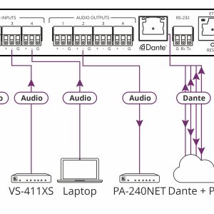 Flexible Audio–Kreuzverbindungen — Komplett konfigurierbare analoge Eingänge (Line, dynamische oder Kondensatormikrofone) und Audio over IP Dante–Kanäle werden gemischt, in das jeweilige Format gewandelt und an jede Kombination von Ausgängen — analog oder Audio over IP Dante–Streams — ausgegeben.