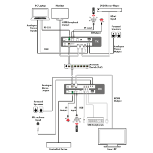 Das System verfügt außerdem über bidirektionale IR- und RS-232-Passthrough, analogen Line-Pegel-Ein-/Ausgang und einen Mikrofoneingang (am Empfänger) und bietet so vielfältige Audiooptionen. Dank der USB-Funktionalität fungiert das System als Remote-USB-Hub. In Kombination mit der HDMI-Ein-/Ausgangsfunktion bietet es eine flexible Remote-Plattform für die nahtlose Steuerung mehrerer PC-Systeme. Konfigurationsinformationen werden über das On-Screen-Display (OSD), die webbasierte Benutzeroberfläche des Encoders sowie über den IP-CS9000 IP Master Controller und direkte Telnet-Befehle bereitgestellt.
