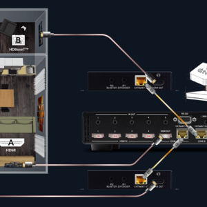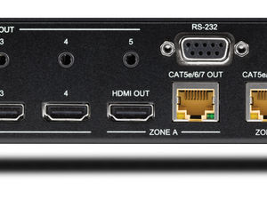 Schaltet 4 HDMI2.0 mit HDCP2.2 mit max. 4K/ UHD@60Hz YUV4:4:4 und 8-Bit Farbtiefe auf 2 unabhängige HDBaseT-Ausgänge, von denen einer auf einen HDMI-Ausgang gespiegelt wird. Das KIT enthält einen passenden HDBaseT-Empfänger (PUV-1710LRX-AVLC).