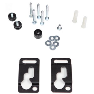 Es basiert auf zwei Wandhalterungen mit N-förmiger Kerbe, die an der gewünschten Stelle an der Wand angebracht werden müssen. Zwei zylindrische Metallbuchsen müssen mit den mitgelieferten Schrauben an den vorgesehenen Stellen am Bassgehäuse befestigt werden. Anschließend müssen die zylindrischen Metallbuchsen in die N-förmige Kerbe der Wandhalter eingehängt werden.