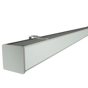 Mit einem neutralen, mattweißen Kasten passt es perfekt zu mittelgroßen und großen Hallen und Räumen. Es kann mit einer breiten Auswahl an PVC-Stoffen, sowohl für Front-und Rück-Projektion montiert werden. Die Stoffe können ganz weiß oder mit schwarzen Rändern, in allen Formaten und Größen bis zu 420 cm auch angepasst werden.