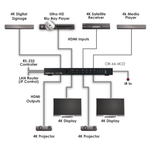 Schaltet 4 HDMI2.0/ HDCP2.2 (max. UHD/ 4K@60Hz YUV4:4:4) auf 4 Wiedergabegeräte. Steuerungsmöglichkeit Fronttasten, RS232, Ethernet oder IR