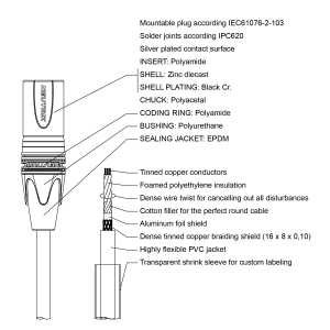 Das PRD955 ist ein 110 Ohm DMX-AES-Kabel, das mit dem PMX422-Kabel aufgebaut ist und mit Neutrik-5-poligen XLR-Steckverbindern ausgestattet ist. Das 22 AWG (0,34 mm²) verzinnte Kupfergeflecht mit doppelter Abschirmung (Al-Folie + TC-Geflecht) eignet sich hervorragend für den professionellen Einsatz in anspruchsvollen Anwendungen. Die verseilten Leiter und der glatte, biegsame Außenmantel sorgen für eine hohe Flexibilität mit einem festen Griff. Der dunkelgraue Außenmantel und die angeschlossene Schrumpfhülse ermöglichen die Unterscheidung von 110 Ohm-Kabeln von anderen, während eine kundenspezifische Beschriftung zur einfachen Identifikation möglich ist.