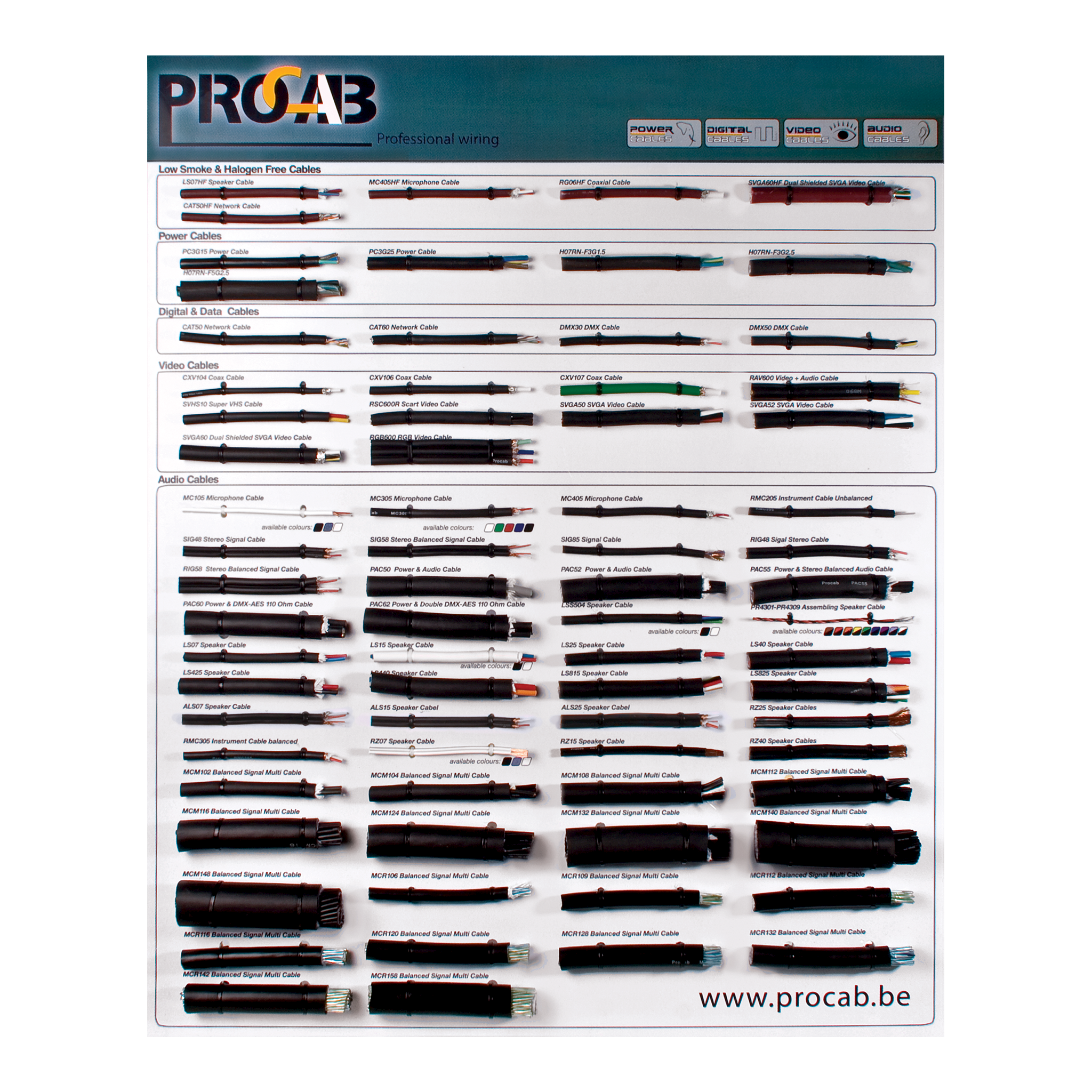 Das Bulk-Display von PROCAB zeigt alle Bulk-Kabel von PROCAB an, um Ihre Kunden darüber zu informieren, wie umfassend das PROCAB-Sortiment ist. Die Kabel sind in 5 Gruppen unterteilt: LSHF, Data, Power, Audio und Video.