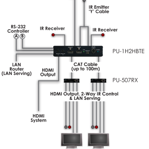 Ermöglicht es, eine HDMI1.4/ HDCP1.1 Signalquelle auf 2 HDBaseT Ausgänge und 1 HDMI Wiedergabegerät auszugeben. Übertragung von HDMI, LAN, PoE, IR und RS232 bis 100m via CAT5e, CAT6 und CAT7 und max. 10.2 Gbps möglich. Kann nur mit den PU-507-RX, PU-507-RXSCD, PU-507-RX2H, PU-507-RX2HCD, PU-HBTE-ZE und PU-507-WPRX verwendet werden.
