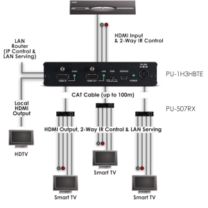 Ermöglicht es, eine HDMI1.4/ HDCP1.1 Signalquelle auf 3 HDBaseT Ausgänge und 1 HDMI Wiedergabegerät auszugeben. Übertragung von HDMI, LAN, PoE und IR bis 100m via CAT5e, CAT6 und CAT7 und max. 10.2 Gbps möglich. Kann nur mit den PU-507-RX, PU-507-RXSCD, PU-507-RX2H, PU-507-RX2HCD, PU-HBTE-ZE und PU-507-WPRX verwendet werden.