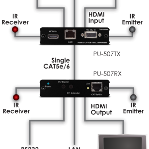 Wandelt das CAT Signal zurück in ein HDMI1.4 (max. 4k, 2k und 1080p) incl. Audio oder DVI Signals, HDMI CEC, LAN, IR und RS232 tw Signals über 1 UTP CAT5e (bis 80m) oder CAT6/7 (bis 100m) Kabel mit der HDBaseT Technologie.