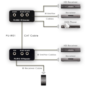 Ermöglicht die Übertragung eines IR Signals über 1 UTP CAT5 oder CAT6 Kabel bis 250m.