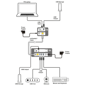Das PU-USB3-KIT ist ein USB 3.2 Gen1 Extender-Set, das das Signal von einem USB-Host auf mehrere USB-Geräte über bis zu 100 Meter (328 Fuß) erweitert.
