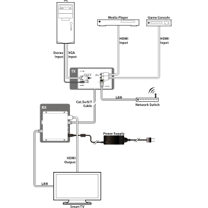Der PUV-1630TXWP-UK Transmitter ist ein 2 x HDMI- und 1 x VGA-Switch, der die Übertragung unkomprimierter HDMI- und VGA-Signale über ein einziges CAT5e/6/7-Kabel ermöglicht. Diese Lösung bietet zusätzlich die Einbettung analoger Audiosignale und eine LAN-Verbindung über dasselbe CAT5e/6/7-Kabel. Die kombinierten HDMI- und Steuersignale können bis zu einer Länge von 100 Metern an einen kompatiblen Receiver der PUV-1600-Serie übertragen werden. Sobald ein Gerät an den PUV-1630TXWP-UK angeschlossen ist, kann die CEC-Steuerung genutzt werden, um das angeschlossene Display einzuschalten und den richtigen HDMI-Eingangskanal auszuwählen (Programmierung über die Web-Oberfläche).