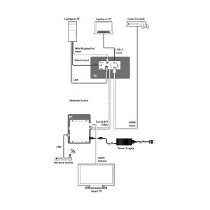 Der PUV-1660TTX Transmitter ist ein Switch mit 1 x HDMI, 1 x USB-C und 1 x Mini-DP (DisplayPort), der die Übertragung unkomprimierter Signale über ein einziges CAT5e/6/7-Kabel ermöglicht. Diese Lösung bietet zusätzlich die Einbettung analoger Audiosignale und eine LAN-Verbindung über dasselbe CAT5e/6/7-Kabel. Diese kombinierten AV- und Steuersignale können über eine Länge von bis zu 100 Metern an einen kompatiblen Receiver der PUV-1600-Serie übertragen werden. Wenn ein Gerät an den PUV-1660TTX angeschlossen ist, kann eine einfache AV-Steuerungsautomatisierung angewendet werden, um das angeschlossene Display „einzuschalten“ und den richtigen HDMI-Eingangskanal auszuwählen (programmiert über die Web-GUI).