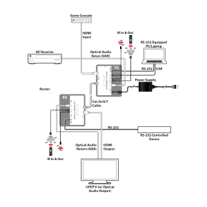 Das PUV-1730PL-AVLC Sender- und Empfänger-Kit ermöglicht die Übertragung von Videoauflösungen bis zu 4K UHD, einschließlich 10/12-Bit HDR und Dolby Vision, zusammen mit HD-Audio, 2-Wege-IR, RS-232 und PoH-Signalen (Power over HDBaseT™) über eine Entfernung von 35 m (4K60 4:4:4) bzw. 70 m (4K60 4:2:0). Diese Lösung bietet fortschrittliches Signalmanagement und gewährleistet zuverlässige Ergebnisse auch in anspruchsvollsten Installationsumgebungen. Audio, Video, Steuerung und Strom werden gleichzeitig über ein einziges CAT6a/7-Kabel bis zu 70 m übertragen. Dank der OAR-Funktion (Optical Audio Return) kann Audio vom Display oder der lokalen Quelle zurück zum Sender gesendet werden.