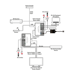 Das PUV-1830-AVLC Sender- und Empfänger-Kit ermöglicht die Übertragung von Videoauflösungen bis zu 4K UHD, einschließlich 10/12-Bit HDR und Dolby Vision, zusammen mit HD-Audio, 2-Wege-IR, RS-232, PoH (Power over HDBaseT) und LAN-Signalen über eine Entfernung von bis zu 70 m (4K 60 4:4:4) bzw. 100 m (4K 60 4:2:0). Diese Lösung bietet fortschrittliches Signalmanagement und gewährleistet zuverlässige Ergebnisse auch in anspruchsvollsten Installationsumgebungen. Audio, Video, Steuerung und Strom werden gleichzeitig über ein einziges CAT6a/7-Kabel bis zu 100 m übertragen. Das Gerät verfügt außerdem über OAR (Optical Audio Return), sodass der Benutzer optisches Audio vom HDBaseT-Empfänger extrahieren kann.