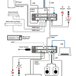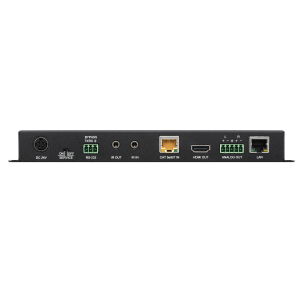 Es werden verschiedene Daten- und Steuersignaltypen unterstützt, darunter USB 2.0, IR, RS-232 und LAN-Anschlüsse. Ein unabhängiger symmetrischer analoger Stereo-Audioausgang ermöglicht die einfache De-Embedding des erweiterten Stereo-Audiosignals. Der HDBaseT-Eingang unterstützt den Empfang von Auflösungen bis zu 4K bei 30 Hz (4:4:4, 8 Bit) oder 4K bei 60 Hz (4:2:0, 8 Bit) von einem kompatiblen HDBaseT-Sender.