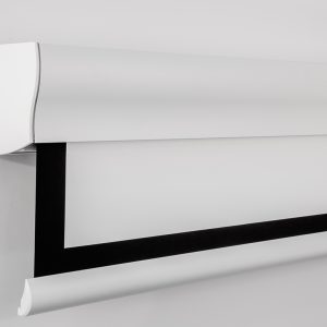 Motorleinwand mit elegantem, harmonischem Design, Wave wird Teil der Möbel. Die Form des Kastens erleichtert die Montage an Wänden und Ecken. Die Oberseite dient als Ablage für das Audiogerät und die Rückseite ist mit einer Rille versehen, in der sich die Kabel verbergen.
