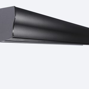 Motorleinwand mit elegantem, harmonischem Design, Wave wird Teil der Möbel. Die Form des Kastens erleichtert die Montage an Wänden und Ecken. Die Oberseite dient als Ablage für das Audiogerät und die Rückseite ist mit einer Rille versehen, in der sich die Kabel verbergen.