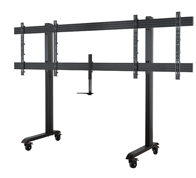 Universelles Design geeignet für die Montage von zwei XL-Bildschirmen nebeneinander.Die Schnittstellenarme sind mit Nivellierschrauben ausgestattet, um die Bildschirmhöhe anzupassen.Das integrierte VC-Regal mit einem verstellbaren Arm ermöglicht die Anbringung einer Kamera über oder unter dem Bildschirm.Das VC-Regal passt für die meisten Kameras mit 1/4″ Gewinde und 100 x 100 mm Befestigungspunkten.Integriertes Kabelmanagement für eine ordentliche Installation.Sicherheits-schrauben helfen, die unbefugte Entfernung des Bildschirms zu verhindern.Verschließbare, nicht markierende 4-Zoll-Rollen.Einfache ‘Aufhängevorrichtung’ zur Bildschirmmontage.