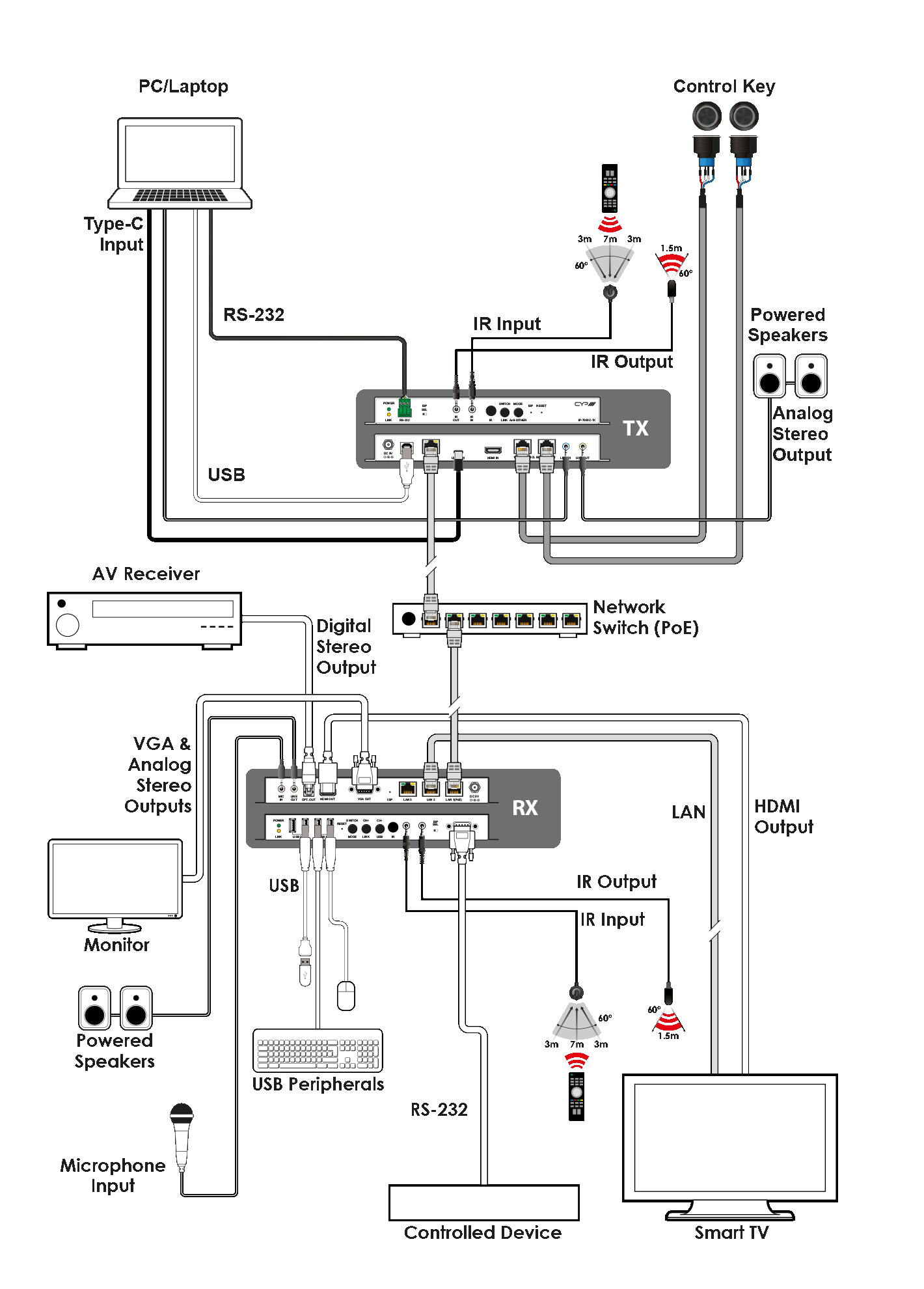 Dieses System verfügt außerdem über bidirektionalen IR-Passthrough, analogen Line-Pegel-Ein-/Ausgang und einen Mikrofoneingang und bietet dem Nutzer vielfältige Audiooptionen. Dank der USB-Funktion fungiert das System als USB-Hub und kann somit als KVM-Switch genutzt werden. Durch das Hinzufügen zusätzlicher Geräte lässt sich das System kaskadieren und so die Übertragungsdistanz ohne Signalverlust oder spürbare Verzögerungen erweitern.