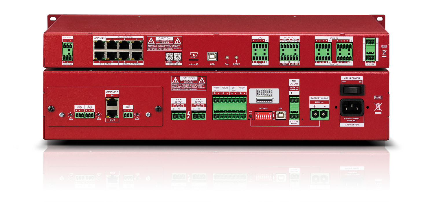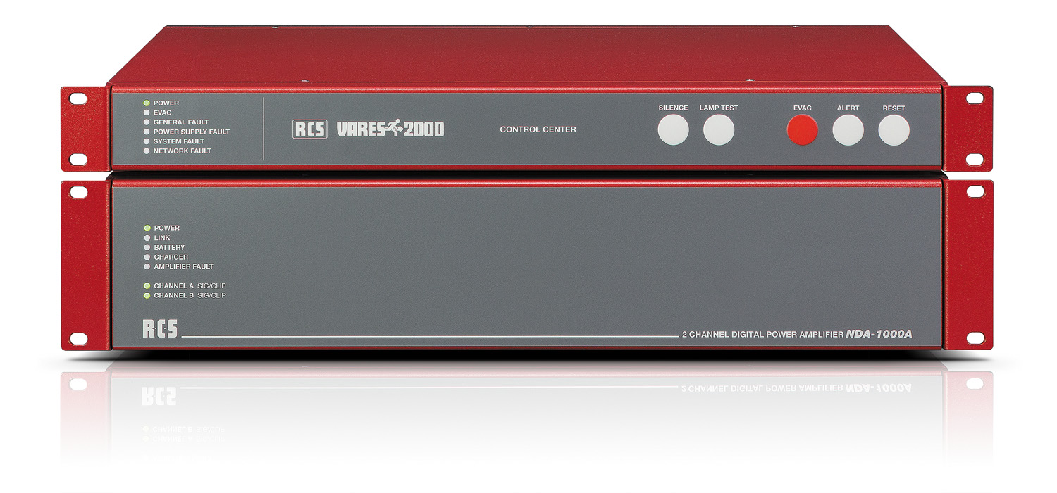 Das VARES-2000 Control-Center verarbeitet die Eingänge entsprechend ihrer eigenen Signalprioritätstabelle und verteilt das Audiosignal über das digitale AMP-Link-Modul, das zwei priorisierte Streams über eine dynamische Zuweisungstechnik verwaltet, an maximal 32x Verstärker NDA-1000 A pro Control-Center.