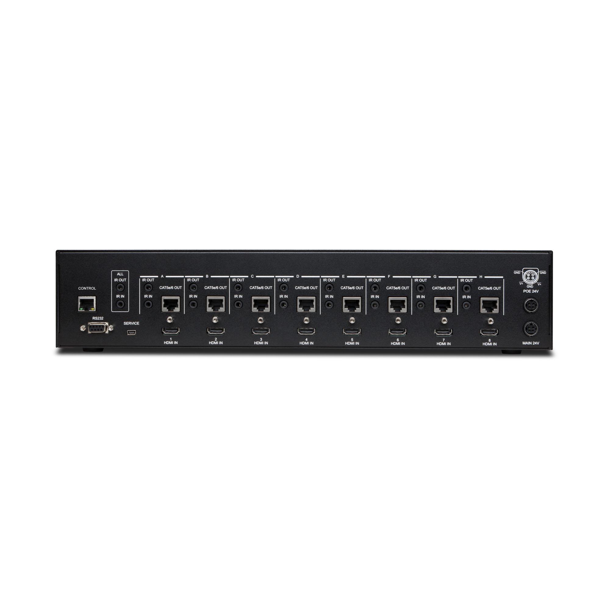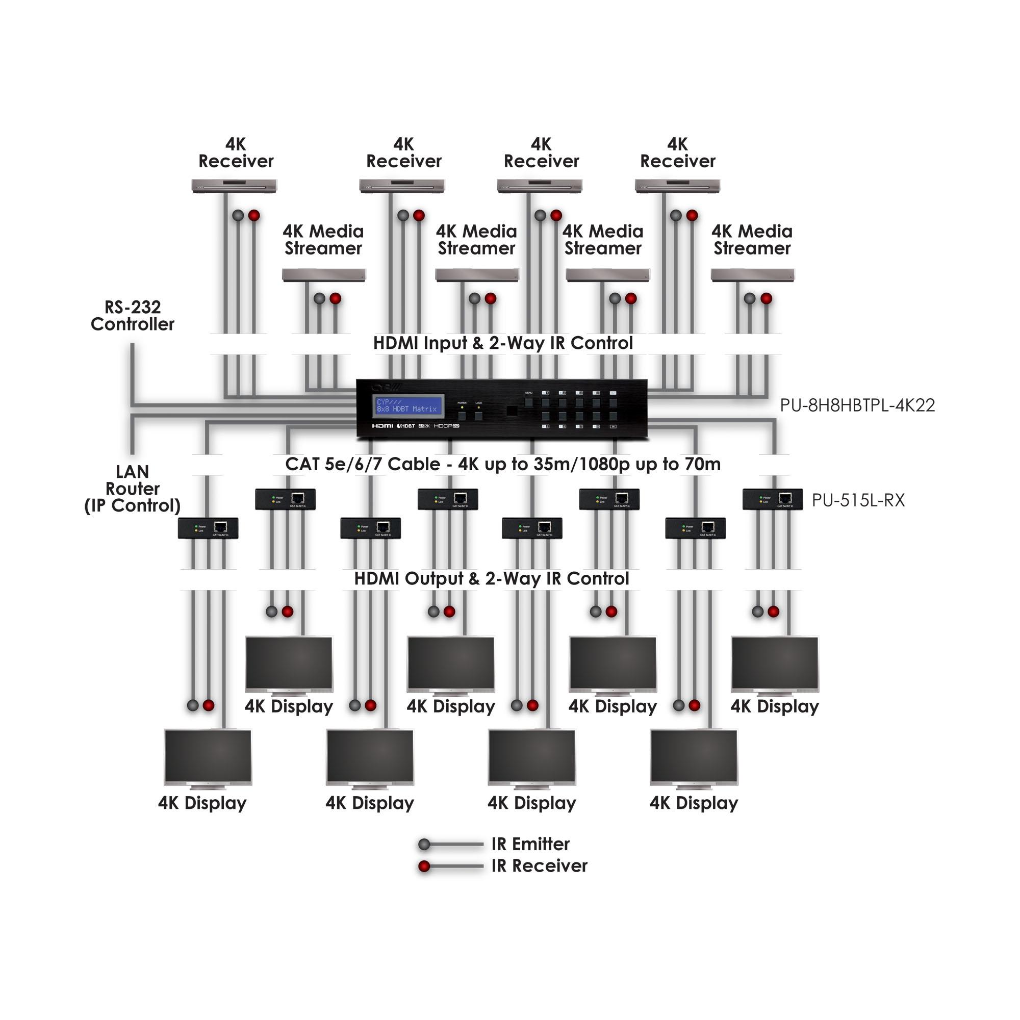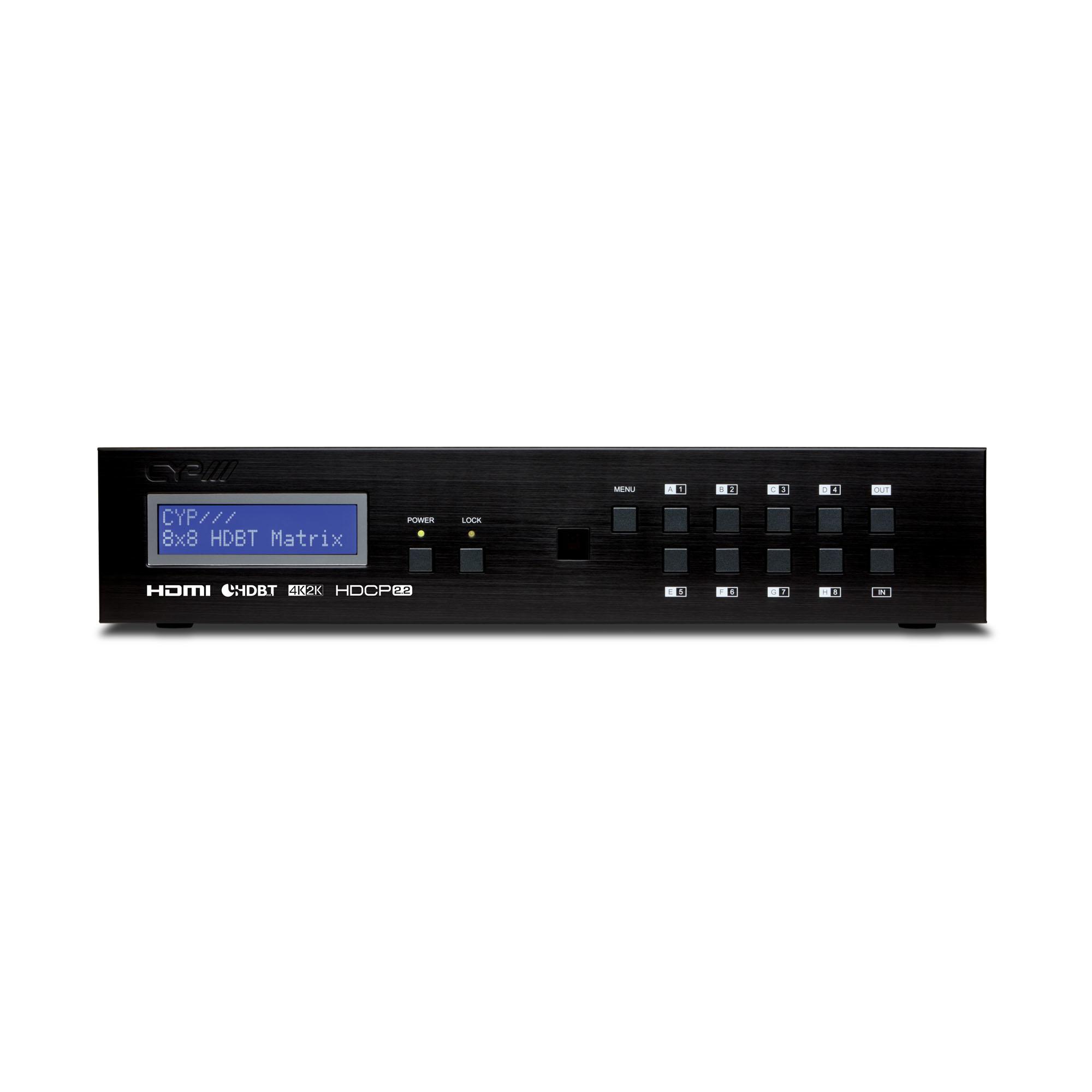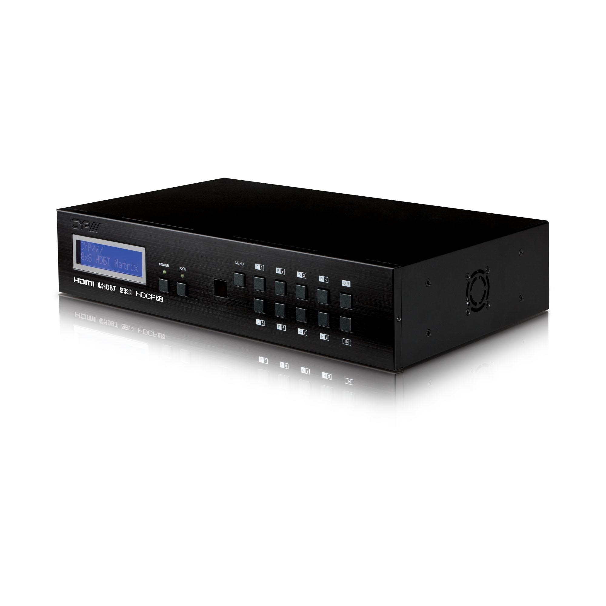 Die 4K2K 8 x 8 HDMI-Matrix über CAT5e/6/7 unterstützt die Übertragung von Video (Auflösungen bis zu 4K2K Full HD, HDCP 2.2) und digitalem Mehrkanal-Audio von acht HDMI-Quellen an acht HDBaseT LITE-Ausgänge über ein einziges CAT5e/6/7-Kabel mit einer Länge von bis zu 60 m. Die Matrix ist kompatibel mit hochauflösenden digitalen Audioformaten wie LPCM 7.1CH, Dolby TrueHD, Dolby Digital Plus und DTS-HD Master Audio sowie mit 3D-Inhalten, die bei Anschluss eines 3D-Fernsehers und einer 3D-Quelle angezeigt werden können. Die Steuerung erfolgt über manuelle Auswahltasten, IR, RS-232, Telnet oder eine Web-Oberfläche. CYP bietet Steuerungstreiber für alle gängigen Steuerungssysteme. Das Gerät unterstützt außerdem UART RS232-Passthrough zu den Receivern.
