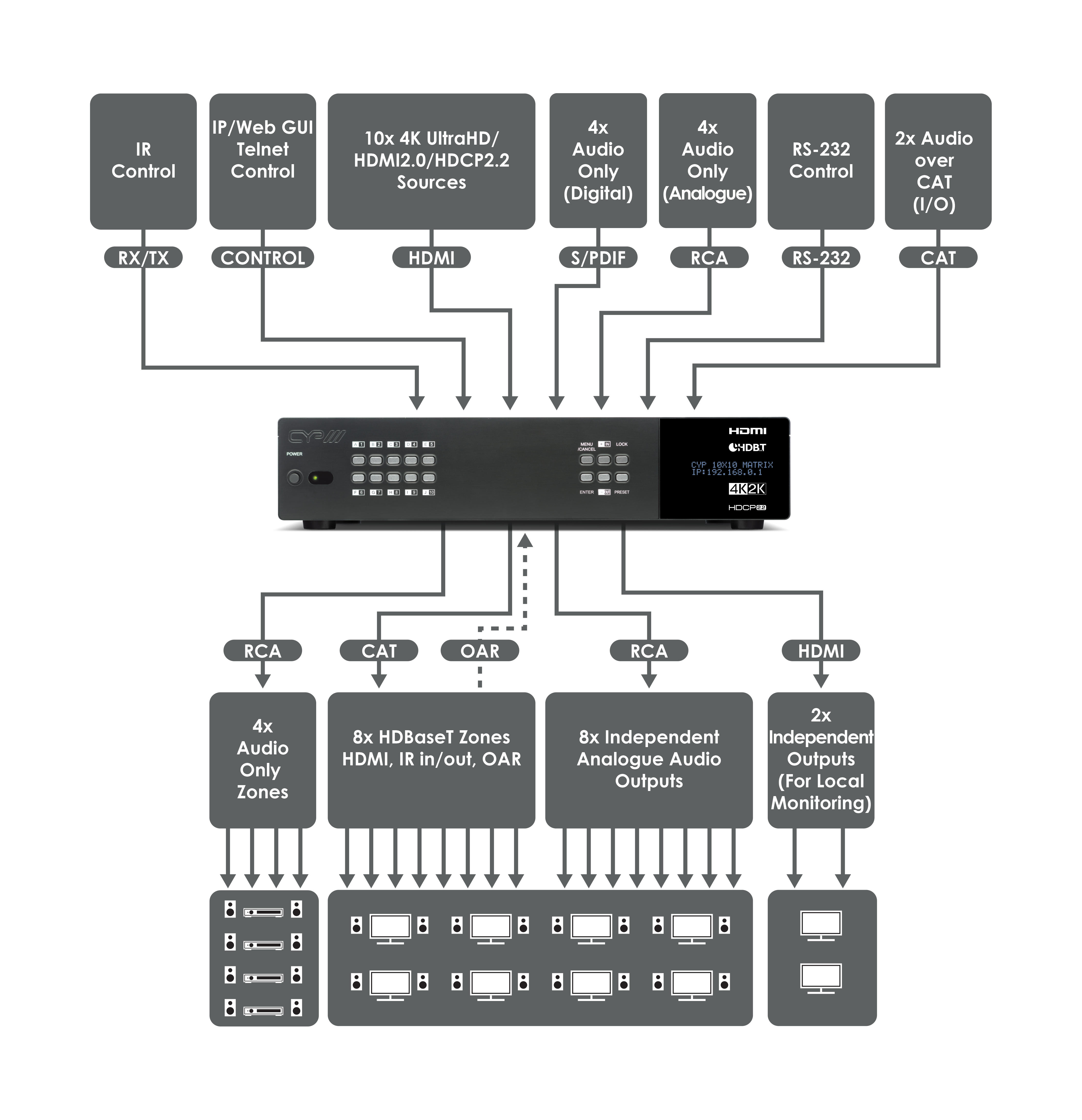 Diese Matrix verfügt über eine unabhängige Audiomatrix mit 14 Audioausgängen und 10 Audioeingängen. Diese Aus- und Eingänge können auch zum De-Embedding von HDMI-Audio in die Audioausgänge und zum Embedding von Audio in die HDBaseT- und HDMI-Ausgänge genutzt werden. Die Audio-CAT-Anschlüsse sowie kompatible bidirektionale Audiomodule (PU-305BD-TX, PU-305BD-RX und PU-305BDA-RX) ermöglichen die Integration mit Remote-Quellen und Remote-Audiozonen. Zusätzlich stehen an allen direkten Audioausgängen Regler für Lautstärke, Stummschaltung, Höhen, Bässe und Audio-Lip-Sink-Korrektur zur Verfügung. Dank der Optical Audio Return (OAR)-Technologie kann der optische Eingang des PUV-1230PLRX-Receivers zurück zur Audiomatrix geleitet werden. Videosignale, die die Bandbreite von HDBaseT überschreiten, werden automatisch konvertiert, um sicherzustellen, dass immer ein Bild an den HDBaseT-Receiver übertragen wird.