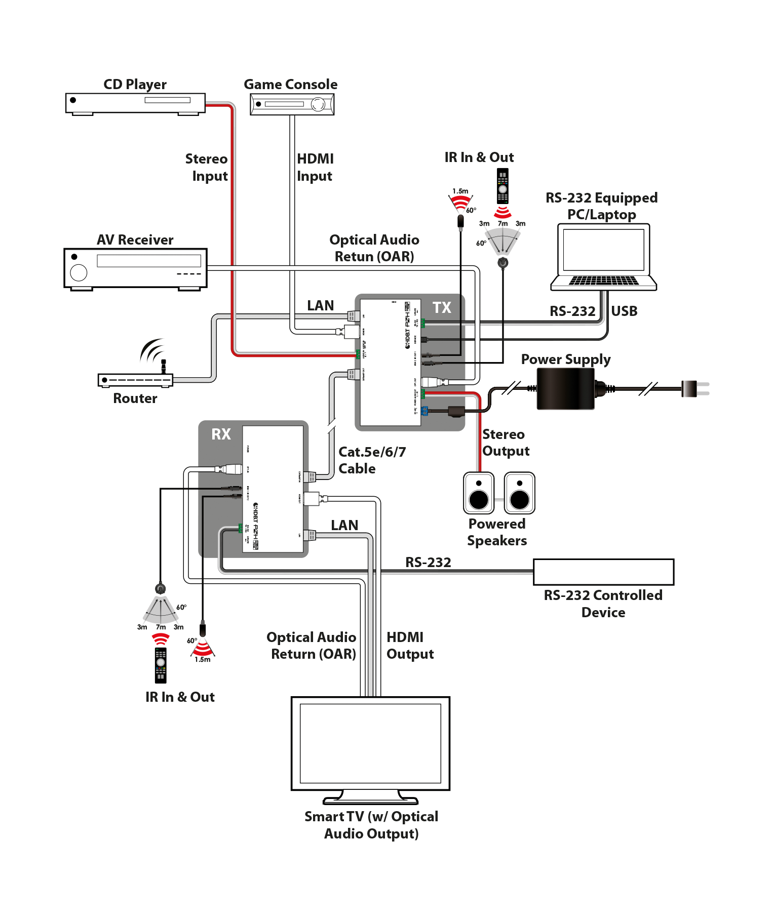 Das PUV-1530-KIT Sender- und Empfänger-Kit ermöglicht die Übertragung von Videoauflösungen bis zu 4K UHD sowie HD-Audio, 2-Wege-IR, RS-232, PoH (Power over HDBaseT), OAR (Optical Audio Return) und LAN-Signalen bis zu 100 m. Diese Lösung bietet erweitertes Signalmanagement und gewährleistet zuverlässige Ergebnisse auch in anspruchsvollsten Installationsumgebungen. Audio, Video, Steuerung und Strom werden gleichzeitig über ein einziges CAT6a/7-Kabel bis zu 100 m übertragen.