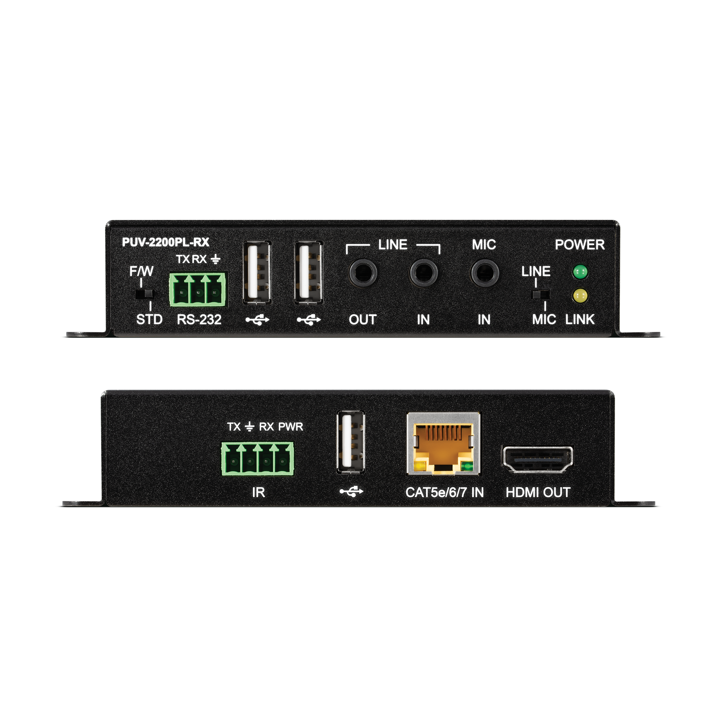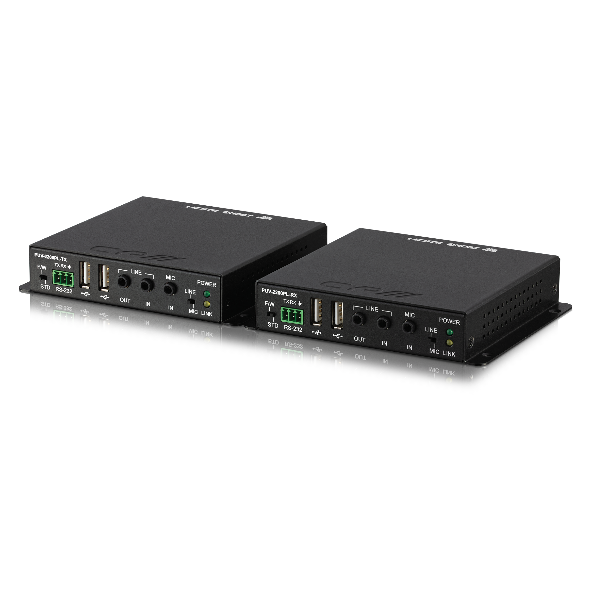 Das PUV-2200PL-KIT HDMI über ein einzelnes CAT5e/6/7-Sender- und Empfänger-Kit kann unkomprimiertes Audio/Video sowie HD-Audio und USB über ein einzelnes CAT5e/6/7-Kabel über eine Entfernung von bis zu 35 Metern übertragen. Das System verfügt außerdem über einen analogen Audio-Ein-/Ausgang und einen Mikrofoneingang für flexible Audiooptionen.